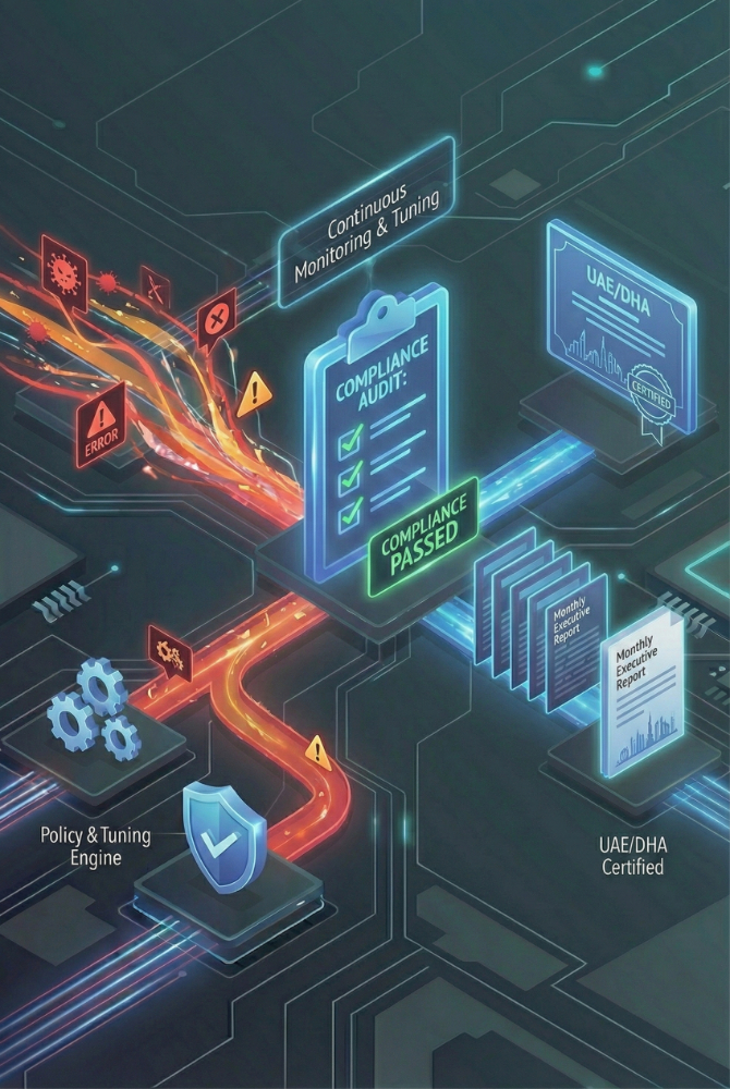 Compliance is a Journey, Not a Destination. We Navigate it For You. Don't just buy security tools—manage the outcome. We provide continuous policy tuning, monitoring, and audit-ready reporting to ensure you stay aligned with DHA and UAE Federal Law No. 2 every single day.